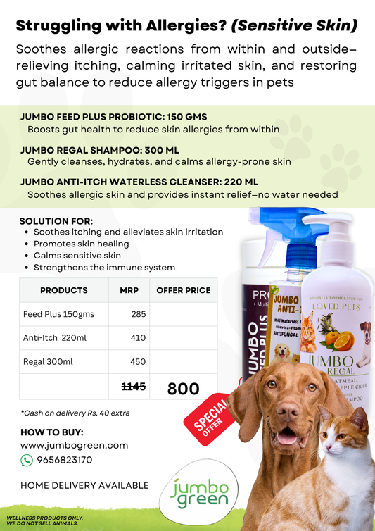 Allergies in pets often show up as persistent itching, irritated skin, or constant licking—triggered by food, dust, or environmental changes. Jumbogreen’s Allergy Combo Collection offers gentle, inside-out relief without relying on harsh chemicals:
