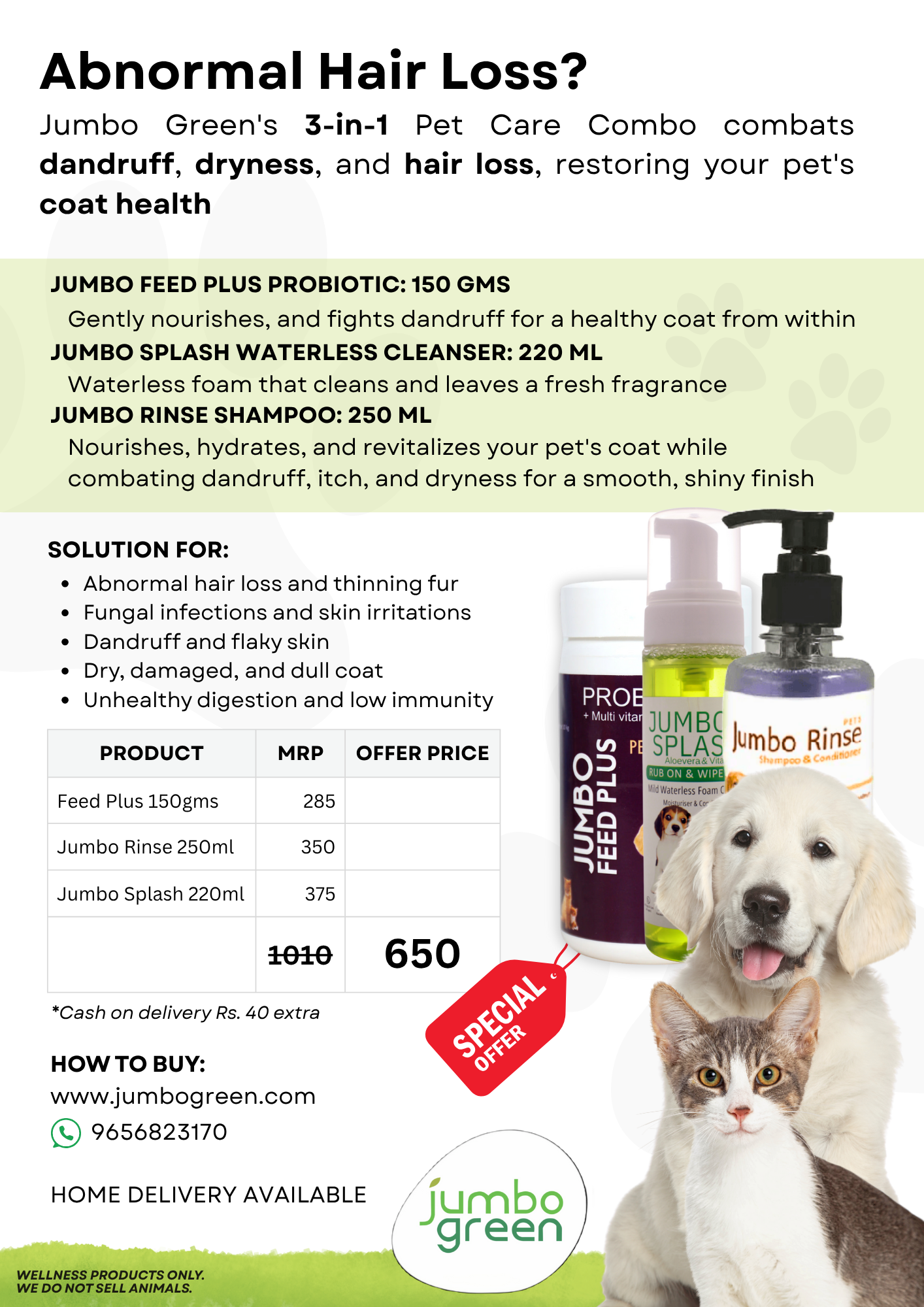 Jumbo Green's 3-in-1 Pet Care Combo combats dandruff, dryness, and hair loss, restoring your pet's coat health.