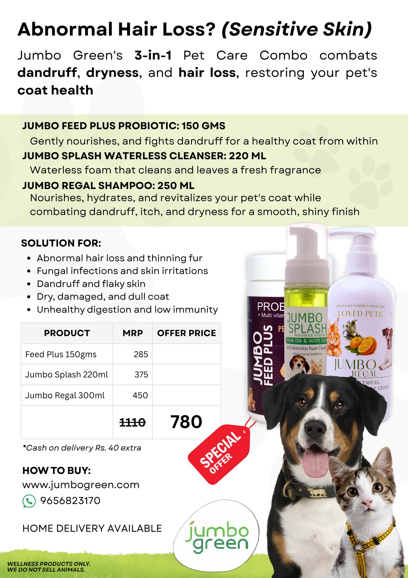 Jumbo Green's 3-in-1 Pet Care Combo combats dandruff, dryness, and hair loss, restoring your pet's coat health. This is the perfect combo for pets with sensitive skin.