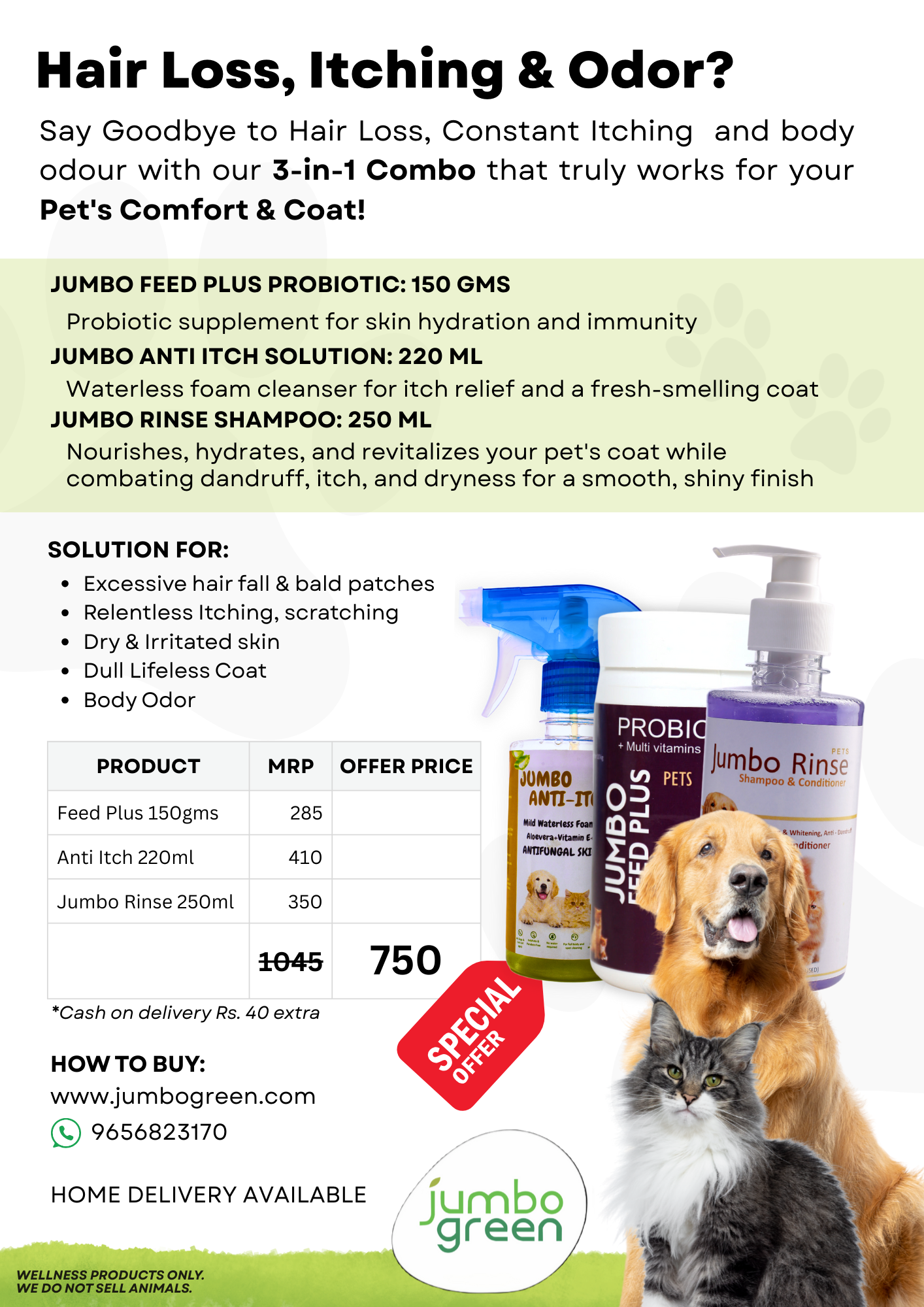 Say goodbye to hair loss, constant itching, and body odor with our 3-in-1 combo that truly works to restore your pet’s comfort and coat. This powerful blend hydrates from within, soothes irritation, and revitalizes your pet’s coat for a smooth, shiny finish.
