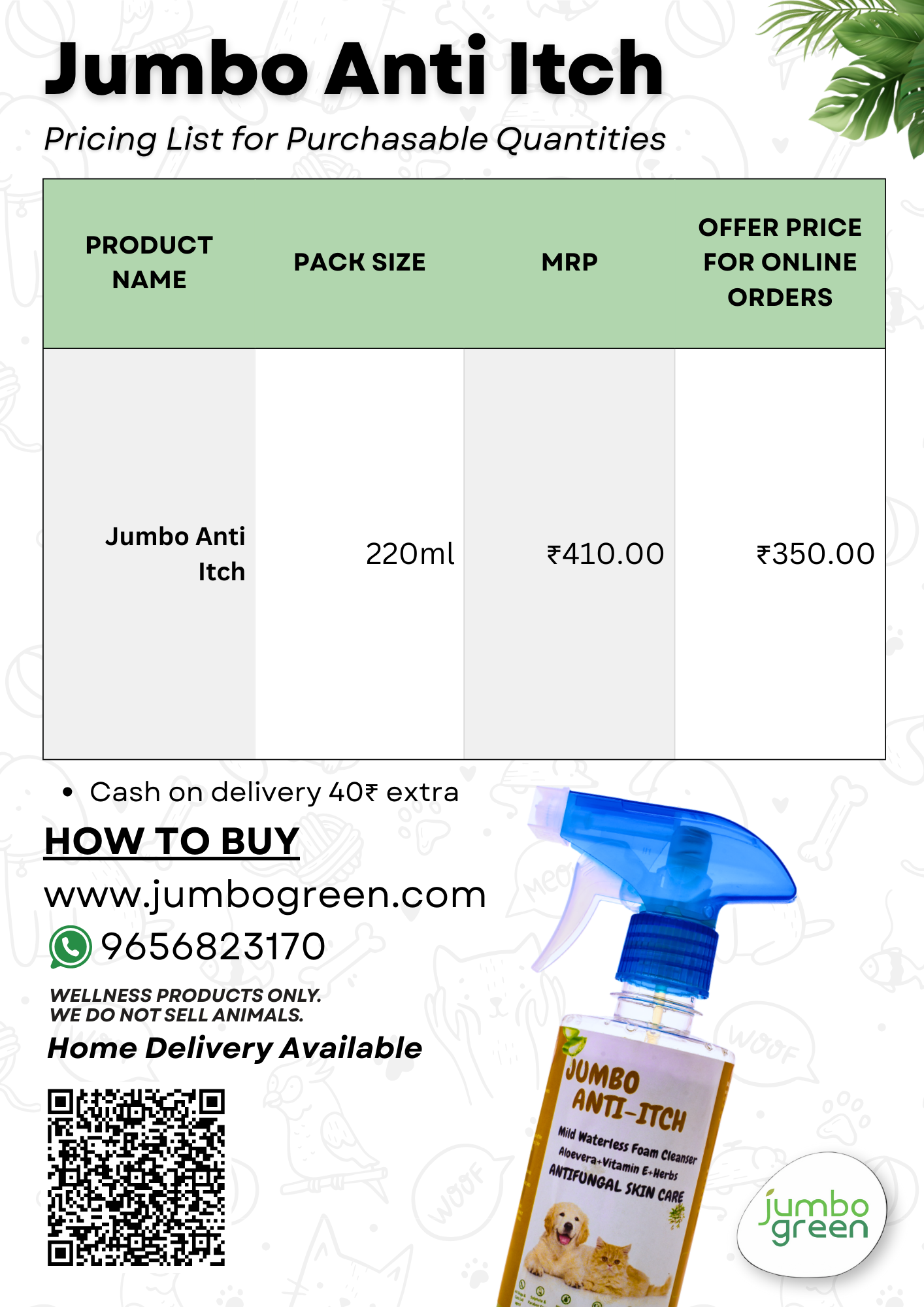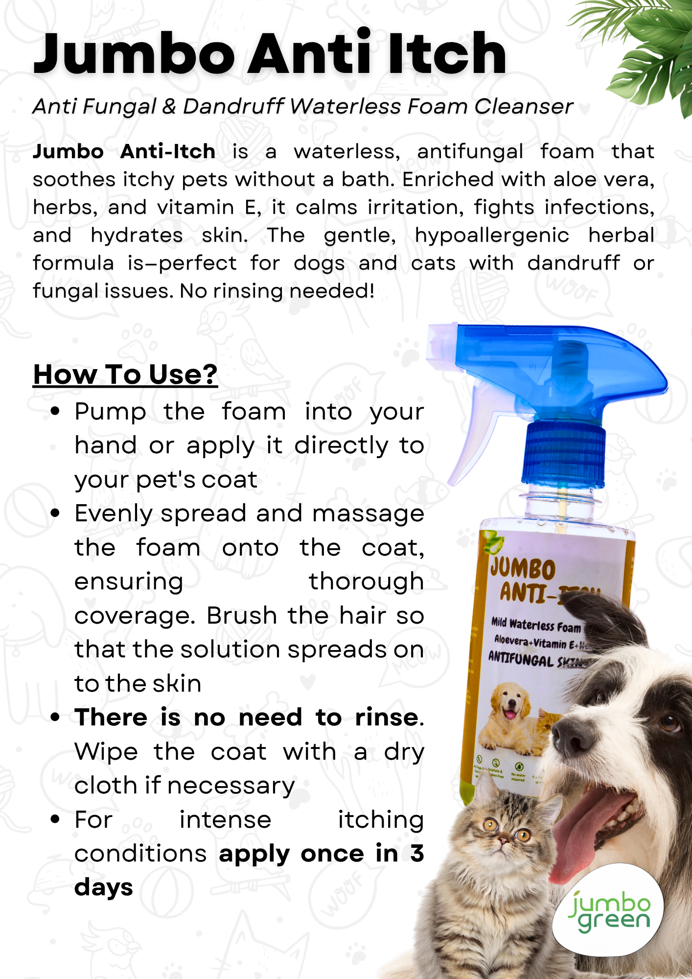Jumbo Anti-Itch is a water-less, anti-fungal foam that soothes itchy pets without a bath. Enriched with aloevera, herbs, and vitamin E, it calms irritation, fights infections, and hydrates skin. The gentle, hypoallergenic herbal formula is—perfect for dogs and cats with dandruff or fungal issues. No rinsing needed!