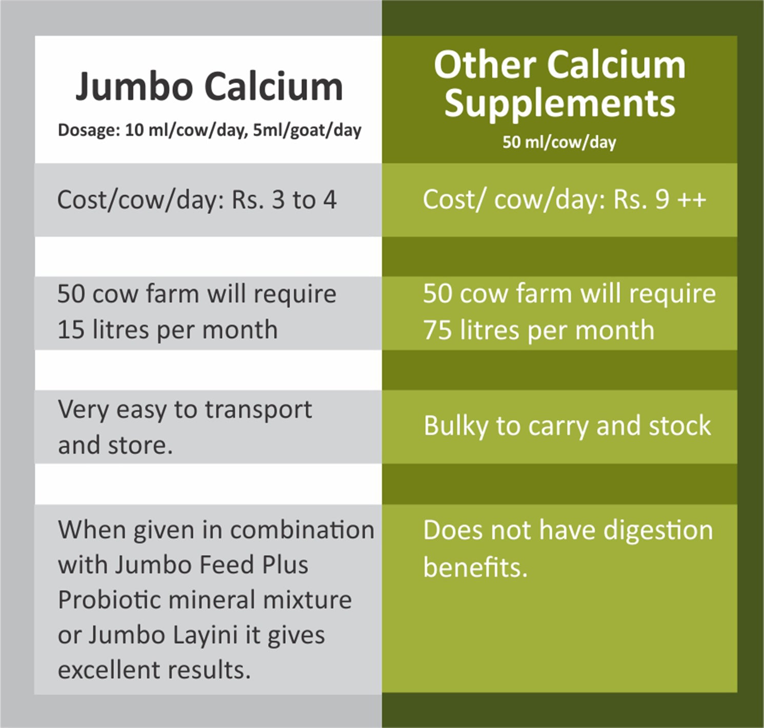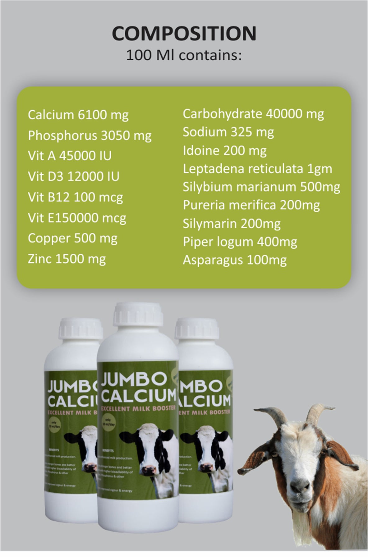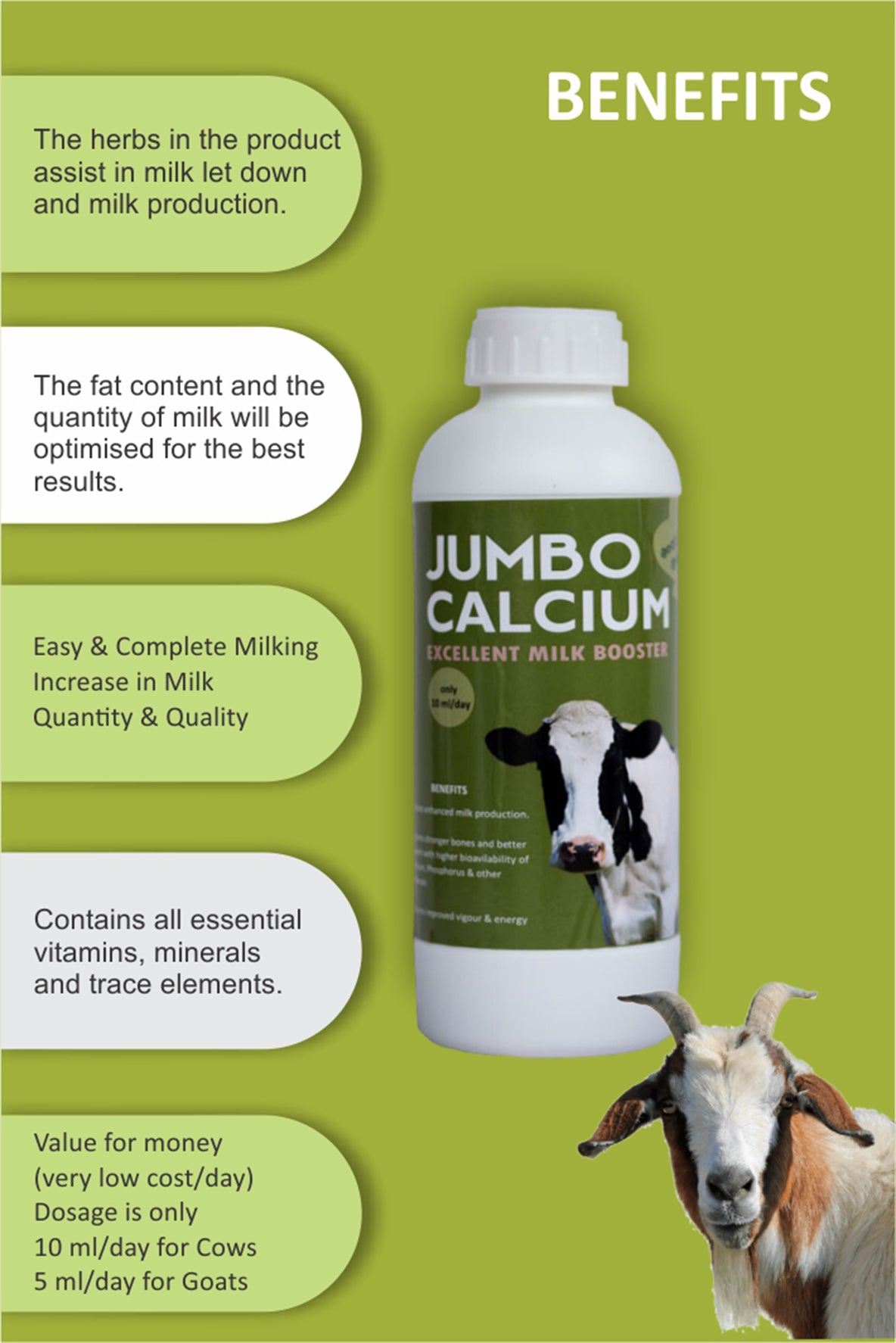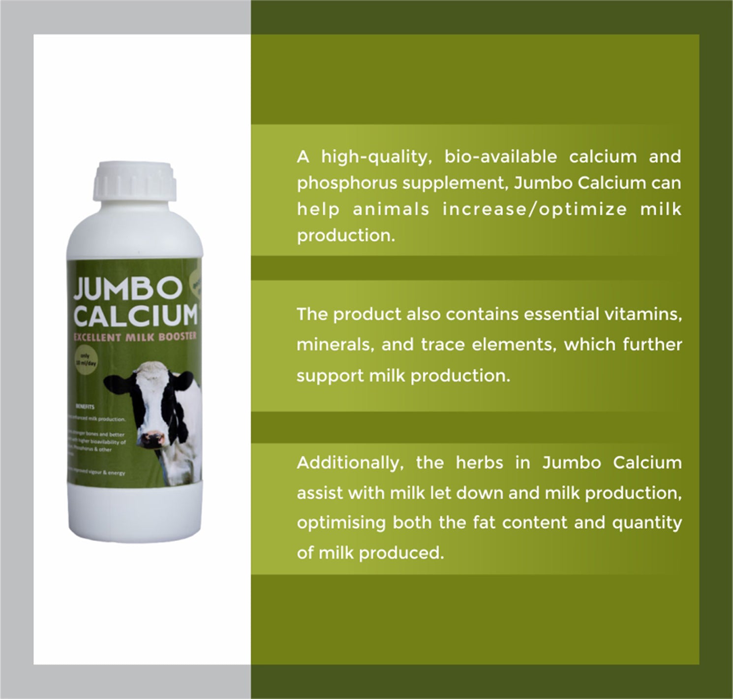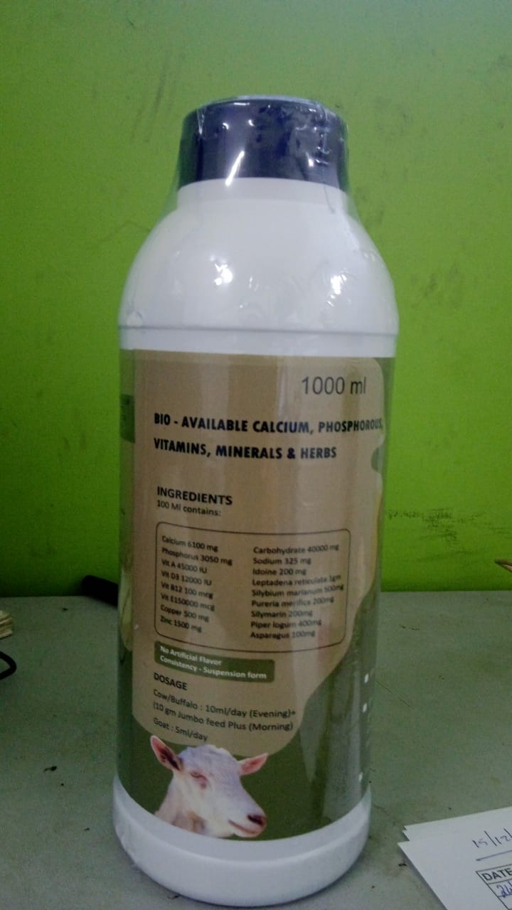 ഉയർന്ന നിലവാരമുള്ള, ജൈവ-ലഭ്യമായ കാൽസ്യം, ഫോസ്ഫറസ് സപ്ലിമെന്റ്, ജംബോ കാൽസ്യം മൃഗങ്ങളെ പാൽ ഉൽപ്പാദനം വർദ്ധിപ്പിക്കാൻ / ഒപ്റ്റിമൈസ് ചെയ്യാൻ സഹായിക്കും.