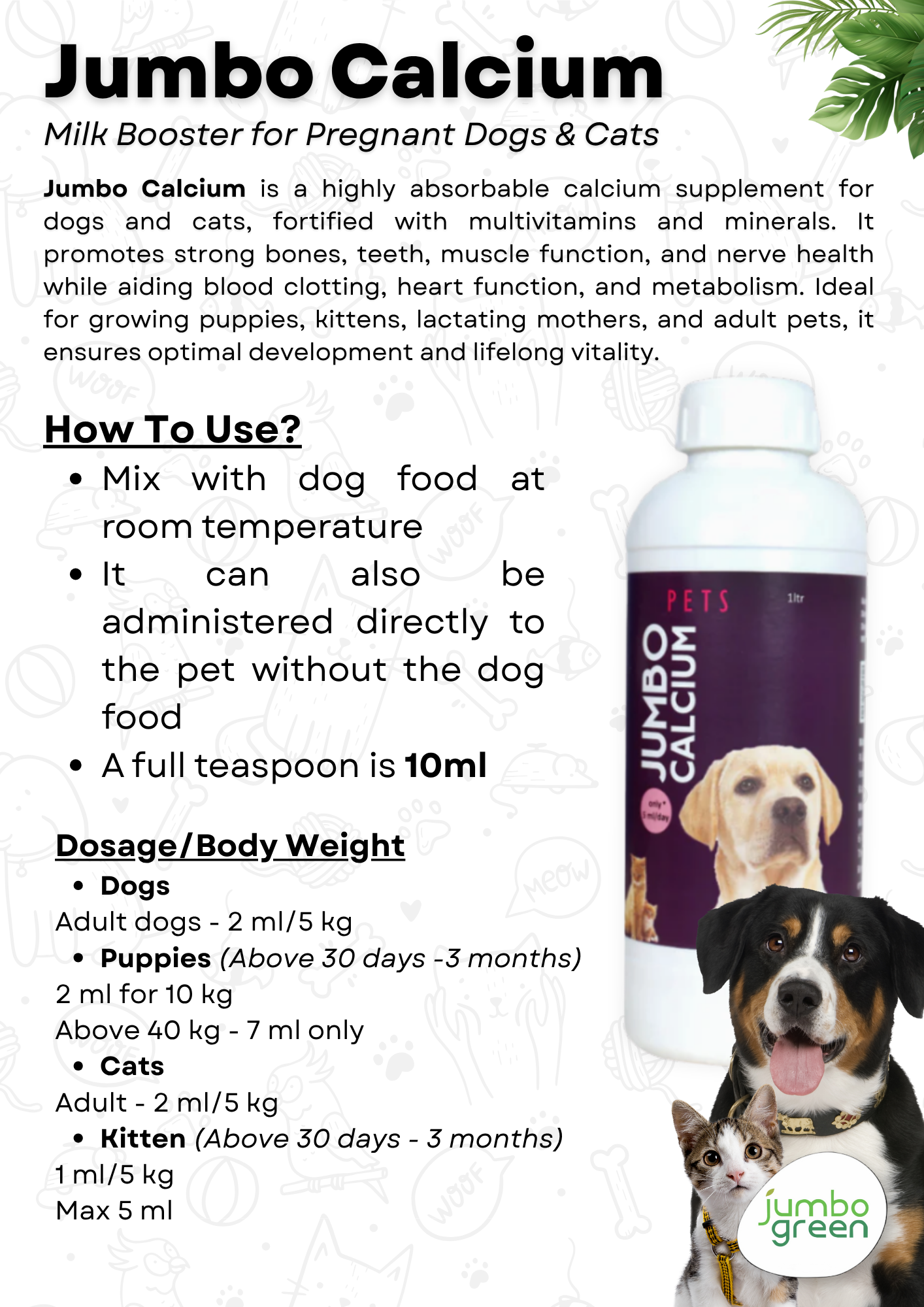 ജംബോ കാൽസ്യം നൽകുന്നത് എളുപ്പവും സൗകര്യപ്രദവുമാണ്, നിങ്ങളുടെ വളർത്തുമൃഗത്തിന്റെ ശരീരഭാരവും പ്രായവും അടിസ്ഥാനമാക്കി പ്രതിദിനം 2 മുതൽ 7 മില്ലി വരെ മാത്രം ശുപാർശ ചെയ്യുന്ന ഡോസ്. നിങ്ങളുടെ രോമമുള്ള കൂട്ടുകാരന് ഉചിതമായ അളവ് നിർണ്ണയിക്കാൻ പാക്കേജിംഗുമായി ബന്ധപ്പെടുക അല്ലെങ്കിൽ നിങ്ങളുടെ മൃഗവൈദ്യനെ സമീപിക്കുക. ഈ അനുയോജ്യമായ സമീപനം നിങ്ങളുടെ വളർത്തുമൃഗങ്ങൾക്ക് അവരുടെ നിർദ്ദിഷ്ട ആവശ്യങ്ങൾക്ക് ആവശ്യമായ പോഷകങ്ങളുടെ ഒപ്റ്റിമൽ അളവ് ലഭിക്കുന്നുണ്ടെന്ന് ഉറപ്പാക്കുന്നു.