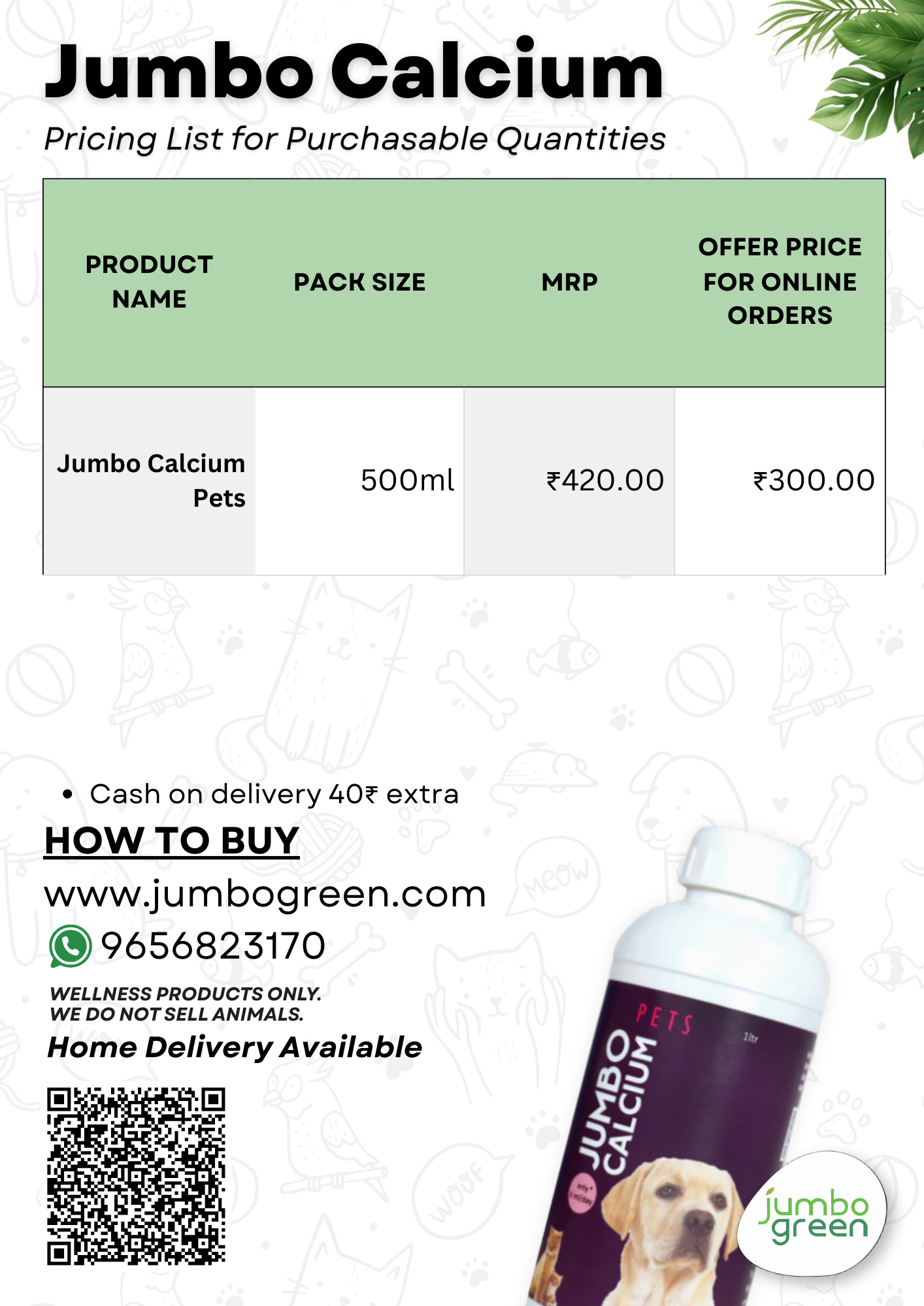 ജംബോ ഗ്രീൻ കാൽസ്യം കേവലം അസ്ഥി പിന്തുണയെക്കാൾ കൂടുതൽ നൽകുന്നു; നിങ്ങളുടെ വളർത്തുമൃഗങ്ങളുടെ ക്ഷേമത്തിന്റെ വിവിധ വശങ്ങൾ നിറവേറ്റുന്ന ഒരു സമഗ്രമായ സപ്ലിമെന്റാണിത്. അസ്ഥികളുടെ ആരോഗ്യത്തിനപ്പുറം, ഈ സപ്ലിമെന്റ് ആരോഗ്യകരമായ ദഹനത്തെ പ്രോത്സാഹിപ്പിക്കുകയും ചർമ്മത്തിന്റെയും കോട്ടിന്റെയും സംരക്ഷണത്തെ പിന്തുണയ്ക്കുകയും കരൾ ടോണിക്ക് ആയി വർത്തിക്കുകയും മൊത്തത്തിലുള്ള ചൈതന്യവും പ്രതിരോധശേഷിയും വർദ്ധിപ്പിക്കുകയും ചെയ്യുന്നു. നിങ്ങളുടെ വളർത്തുമൃഗങ്ങൾക്ക് ജംബോ ഗ്രീൻ കാൽസ്യം ഉപയോഗിച്ച് സമ്പൂർണ്ണവും സമഗ്രവുമായ പരിചരണം സമ്മാനിക്കുക.