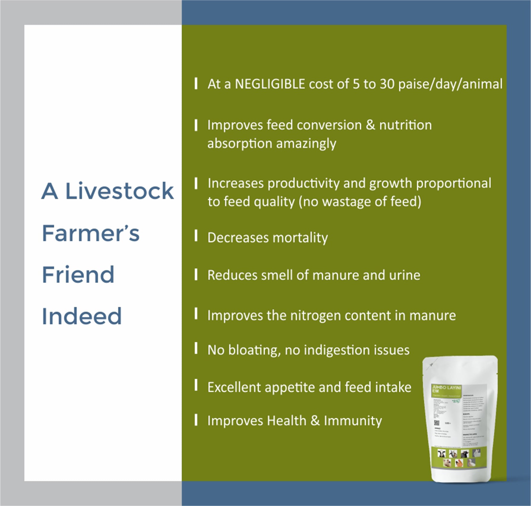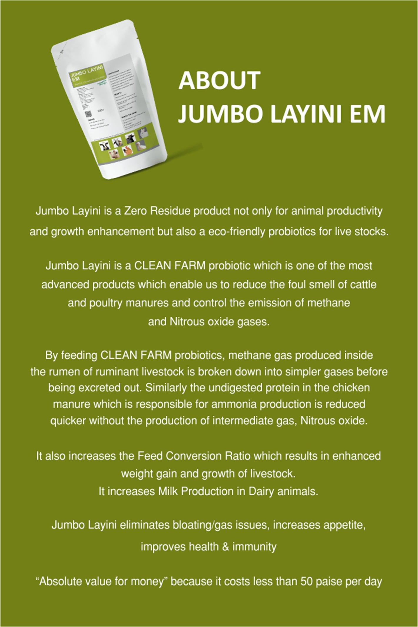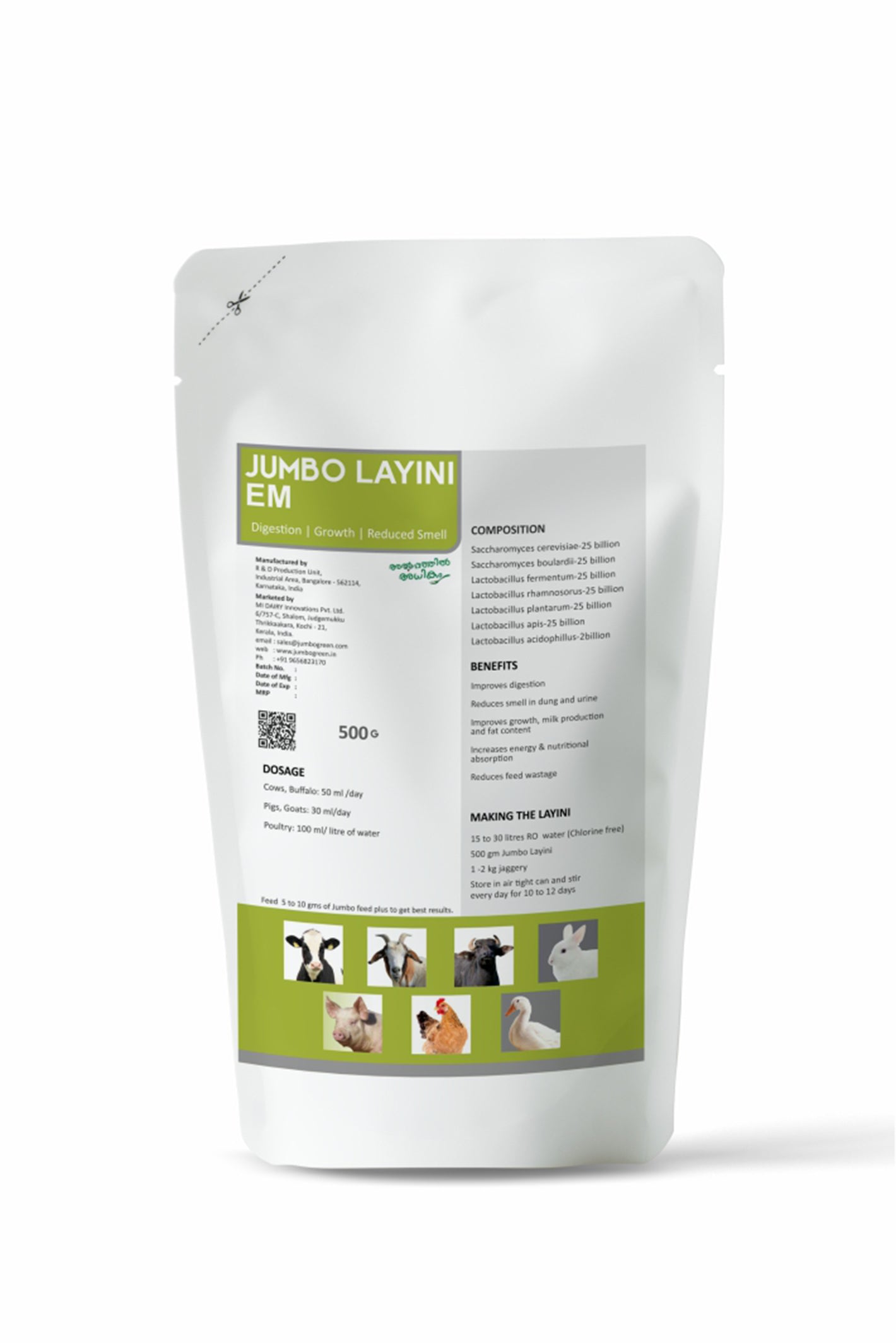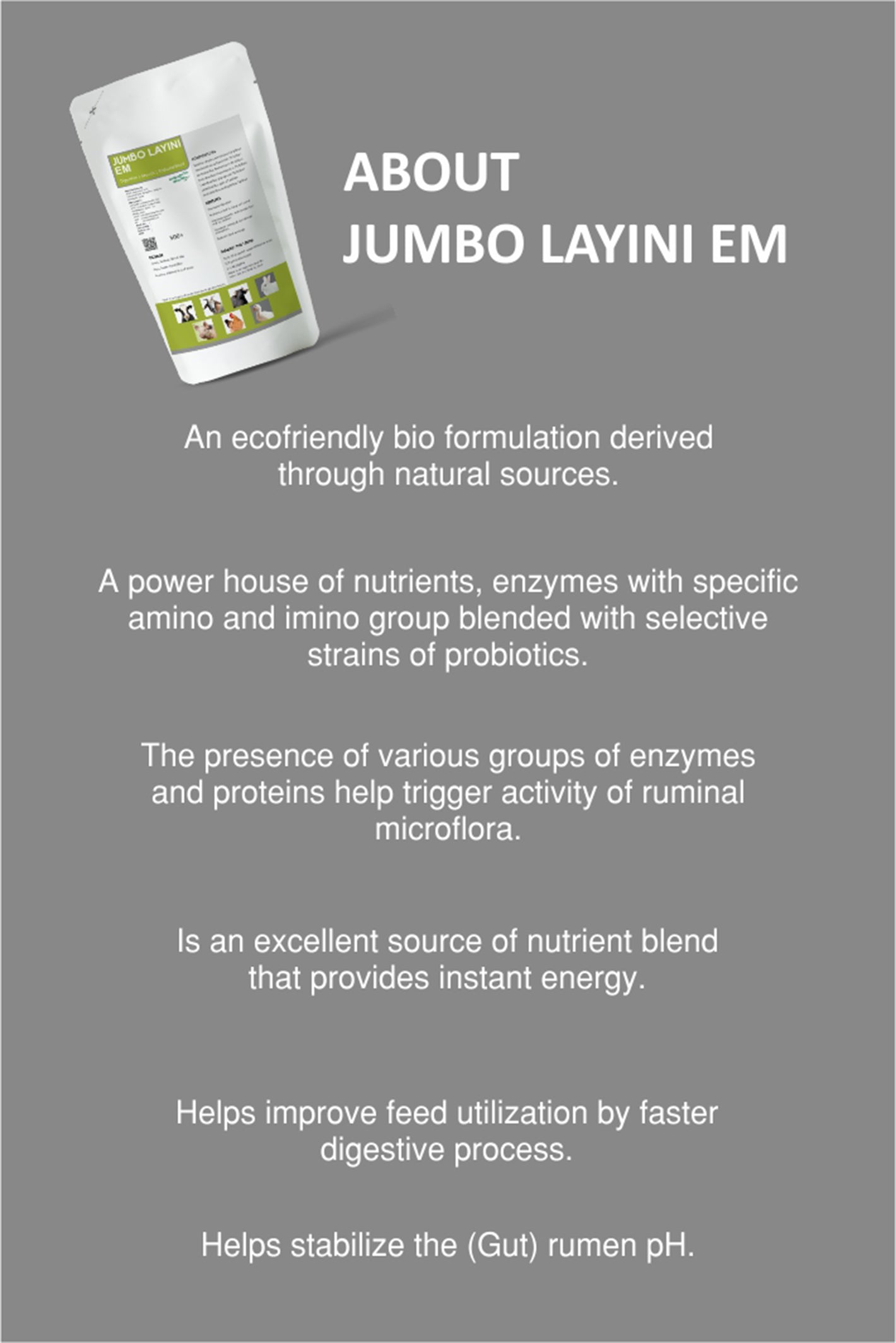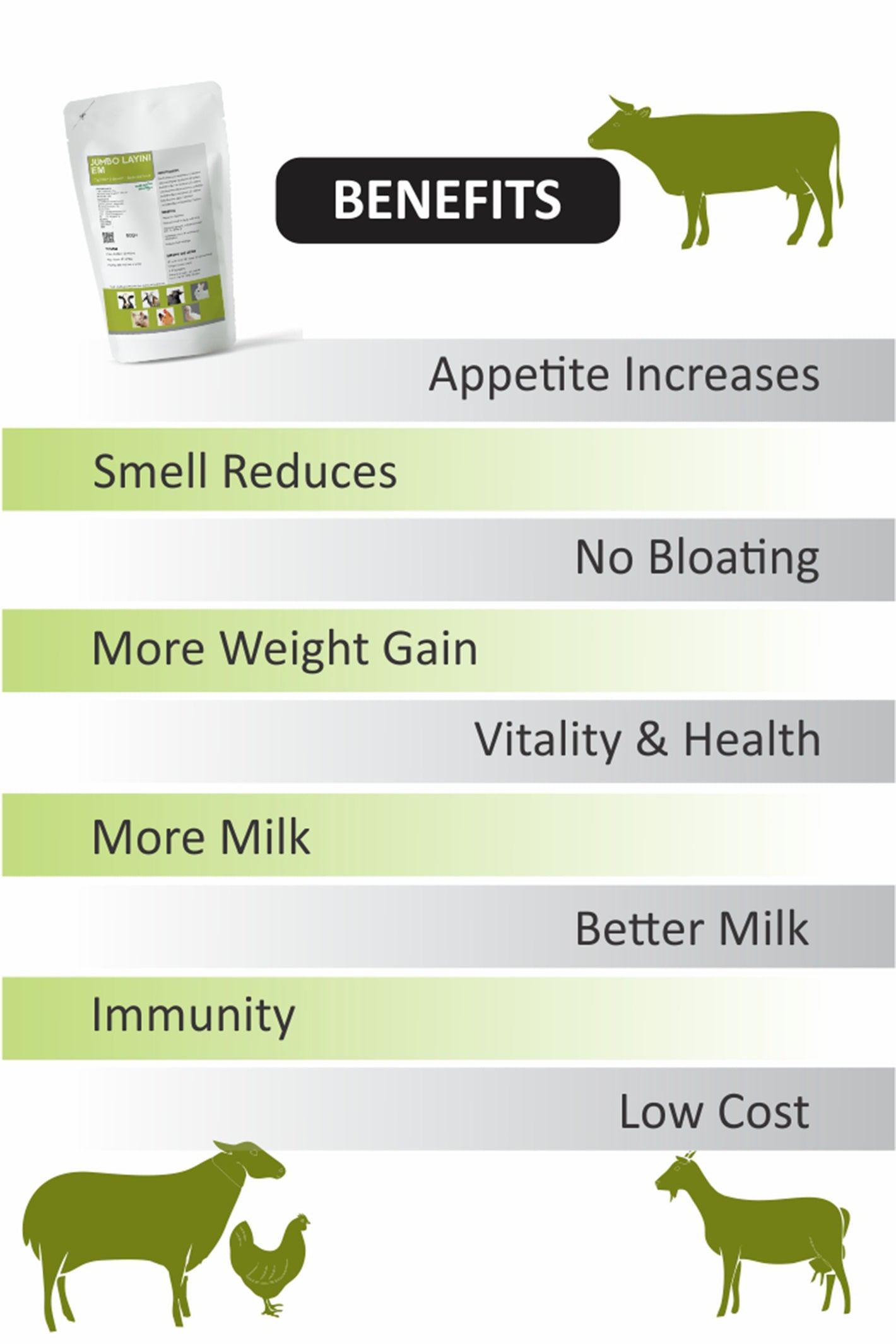 ജംബോ ലയിനി മൃഗങ്ങളുടെ പോഷണ മേഖലയിലെ ഒരു മുന്നേറ്റ ഉൽപ്പന്നമാണ്. കന്നുകാലികളുടെ വളർച്ചയും ഉൽപ്പാദനക്ഷമതയും വർദ്ധിപ്പിക്കുന്നതിനായി പ്രത്യേകം രൂപകൽപ്പന ചെയ്ത പ്രകൃതിദത്ത സ്രോതസ്സുകളിൽ നിന്ന് നിർമ്മിച്ച പരിസ്ഥിതി സൗഹൃദ ബയോ ഫോർമുലേഷനാണിത്. പോഷകങ്ങൾ, എൻസൈമുകൾ, പ്രോബയോട്ടിക്സ് എന്നിവയുടെ ശക്തമായ മിശ്രിതത്തിൽ നിന്നാണ് ഉൽപ്പന്നം ഉരുത്തിരിഞ്ഞത്, ഇത് ദഹനപ്രക്രിയ മെച്ചപ്പെടുത്തുന്നതിനും റുമെൻ പിഎച്ച് സ്ഥിരപ്പെടുത്തുന്നതിനും പശുക്കളുടെ പാലുത്പാദനം വർദ്ധിപ്പിക്കുന്നതിനും ഒരുമിച്ച് പ്രവർത്തിക്കുന്നു. അതിന്റെ ഗുണങ്ങൾ ഇവയാണ്: