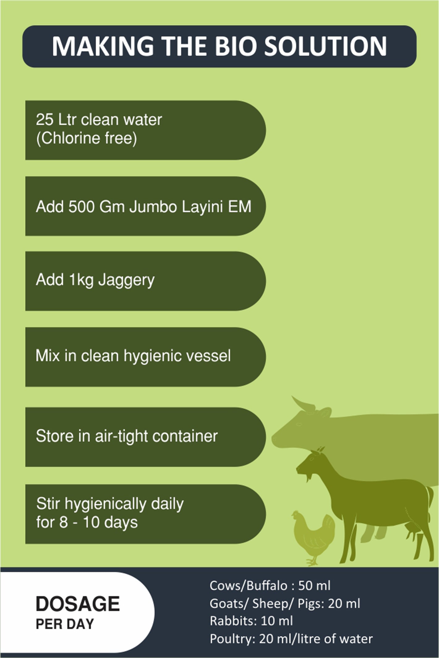 ലേക്ക് ഒരു ലയിനി ലായനി തയ്യാറാക്കുക , 500 ഗ്രാം ലയിനി പൊടി 15-20 ലിറ്റർ RO വെള്ളവും 1 കിലോ ശർക്കരയും ശുദ്ധമായ വായു കടക്കാത്ത പാത്രത്തിൽ കലർത്തുക. 8 മുതൽ 10 ദിവസം വരെ ദിവസവും ഇളക്കുക. ചെറിയ അളവിൽ, 100 ഗ്രാം ഇളക്കുക ശുദ്ധവായു കടക്കാത്ത പാത്രത്തിൽ 5 ലിറ്റർ RO വെള്ളവും 300 ഗ്രാം ശർക്കരയും ചേർത്ത് ലയിനി പൊടി. 8 മുതൽ 10 ദിവസം വരെ ദിവസവും ഇളക്കുക.