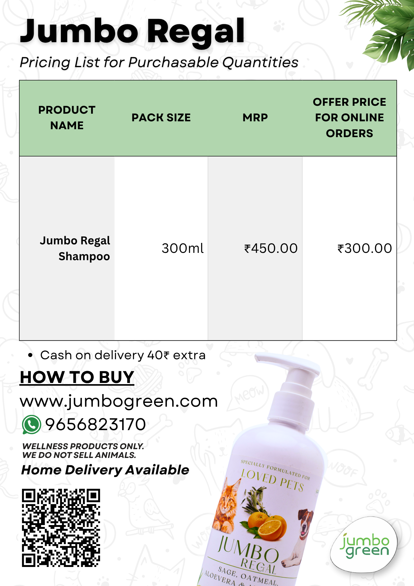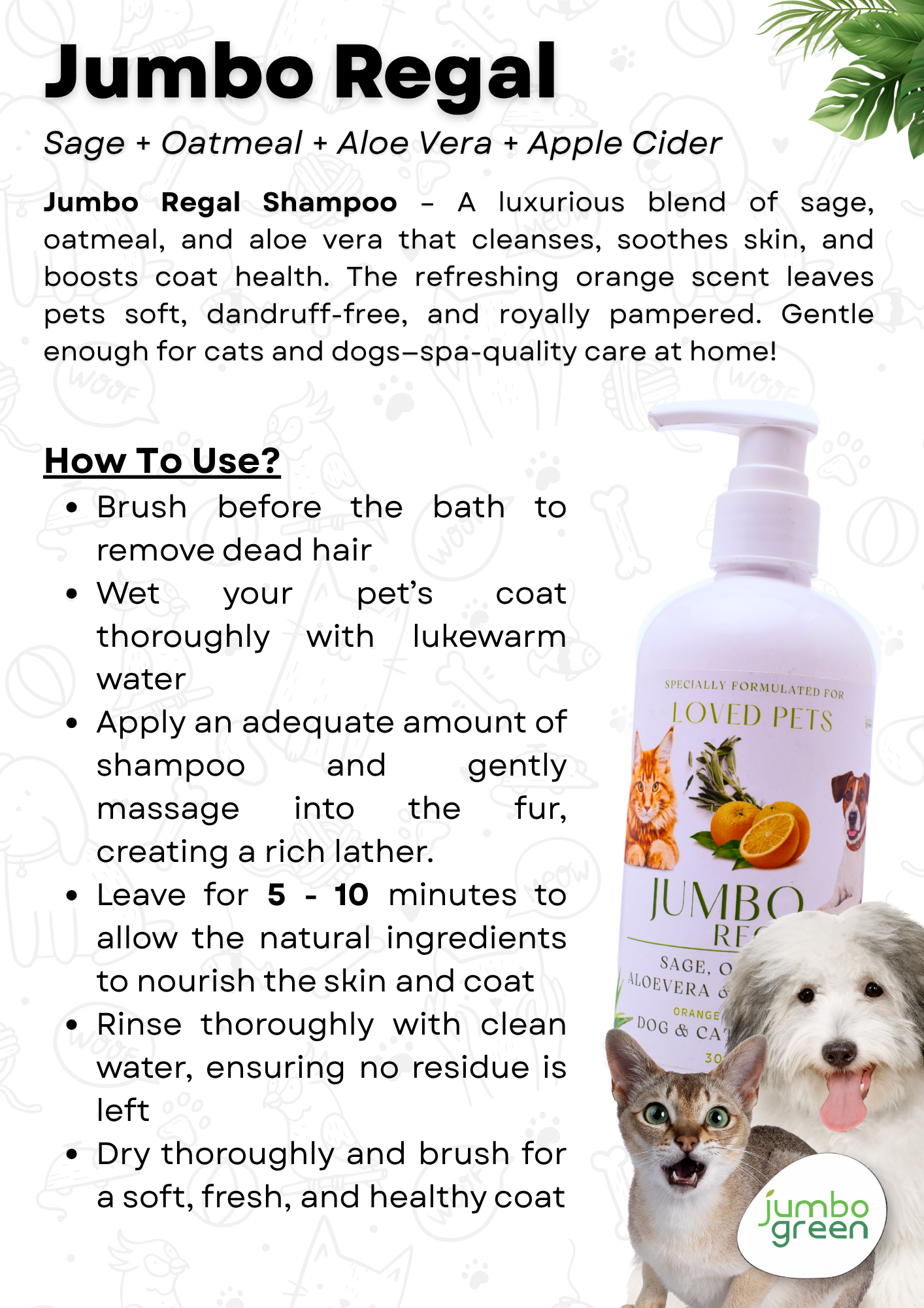 Jumbo Regal Shampoo is a luxurious blend of sage, oatmeal, and aloe vera that cleanses, soothes skin, and boosts coat health. The refreshing orange scent leaves pets soft, dandruff-free, and royally pampered. Gentle enough for cats and dogs—spa-quality care at home!