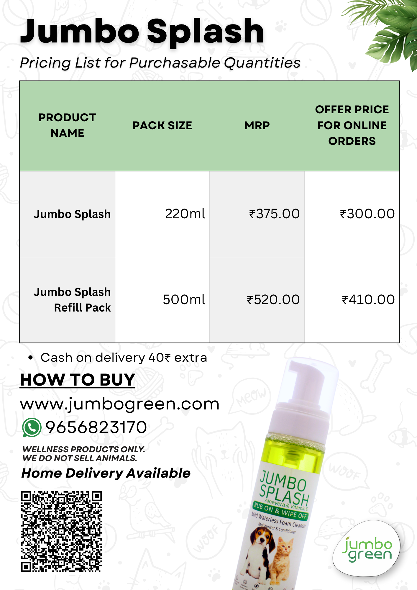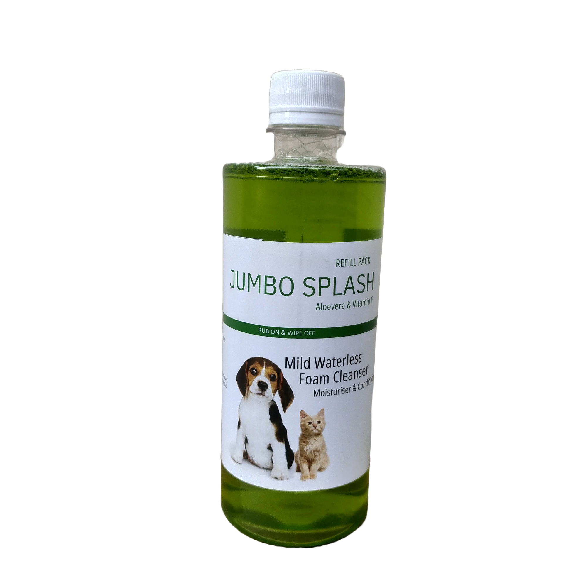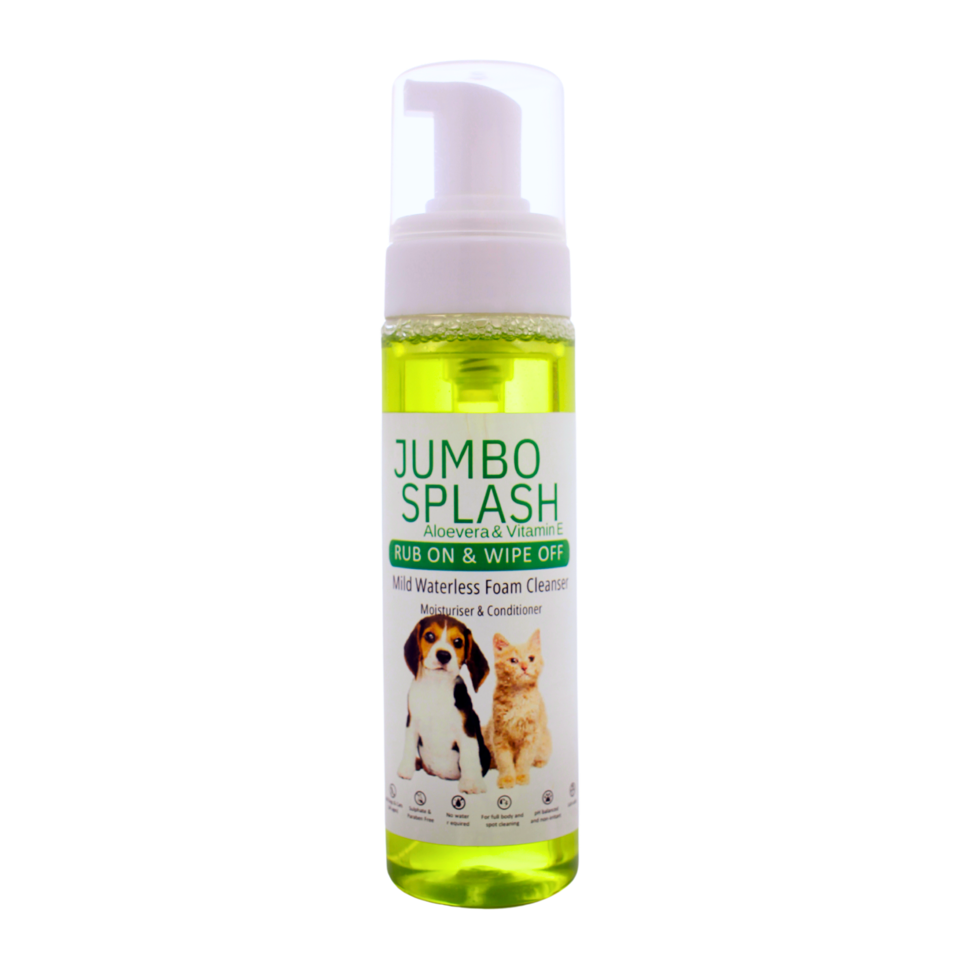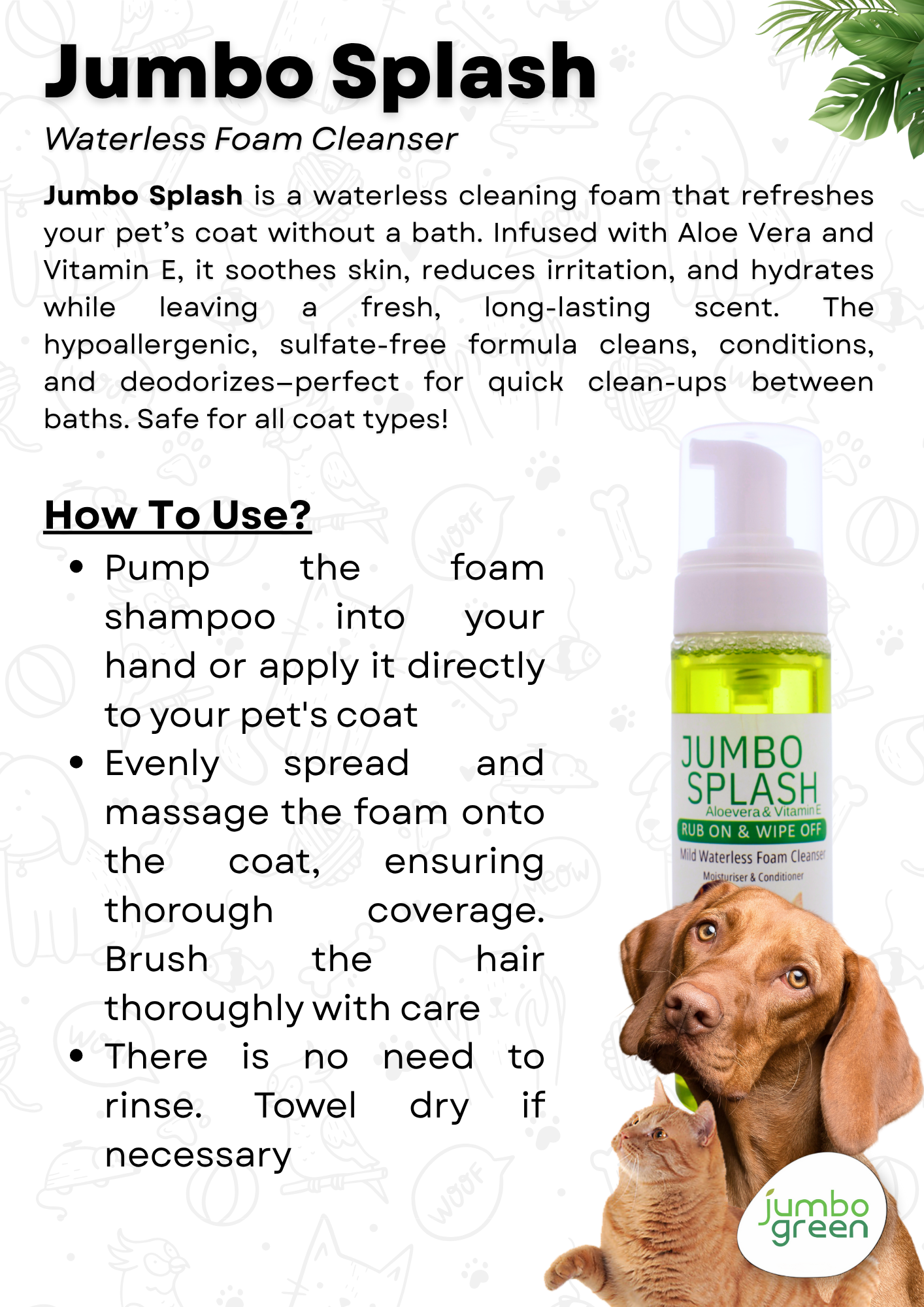 നിങ്ങളുടെ വളർത്തുമൃഗത്തെ വൃത്തിയും ആരോഗ്യവും സന്തോഷവും നിലനിർത്തുന്ന വെള്ളമില്ലാത്ത നുരയെ വൃത്തിയാക്കുന്ന ജംബോ സ്പ്ലാഷിന്റെ സൗകര്യവും ഫലപ്രാപ്തിയും അനുഭവിക്കുക . സൗമ്യവും പോഷിപ്പിക്കുന്നതുമായ ഗുണങ്ങളാൽ, സുരക്ഷിതവും സൗകര്യപ്രദവുമായ ചമയത്തിനുള്ള പരിഹാരം തേടുന്ന വളർത്തുമൃഗ ഉടമകൾക്ക് ജംബോ സ്പ്ലാഷ് മികച്ച തിരഞ്ഞെടുപ്പാണ്. നിങ്ങളുടെ വളർത്തുമൃഗത്തിന് അർഹമായ പരിചരണം നൽകാൻ ജംബോ സ്പ്ലാഷിനെ വിശ്വസിക്കൂ.