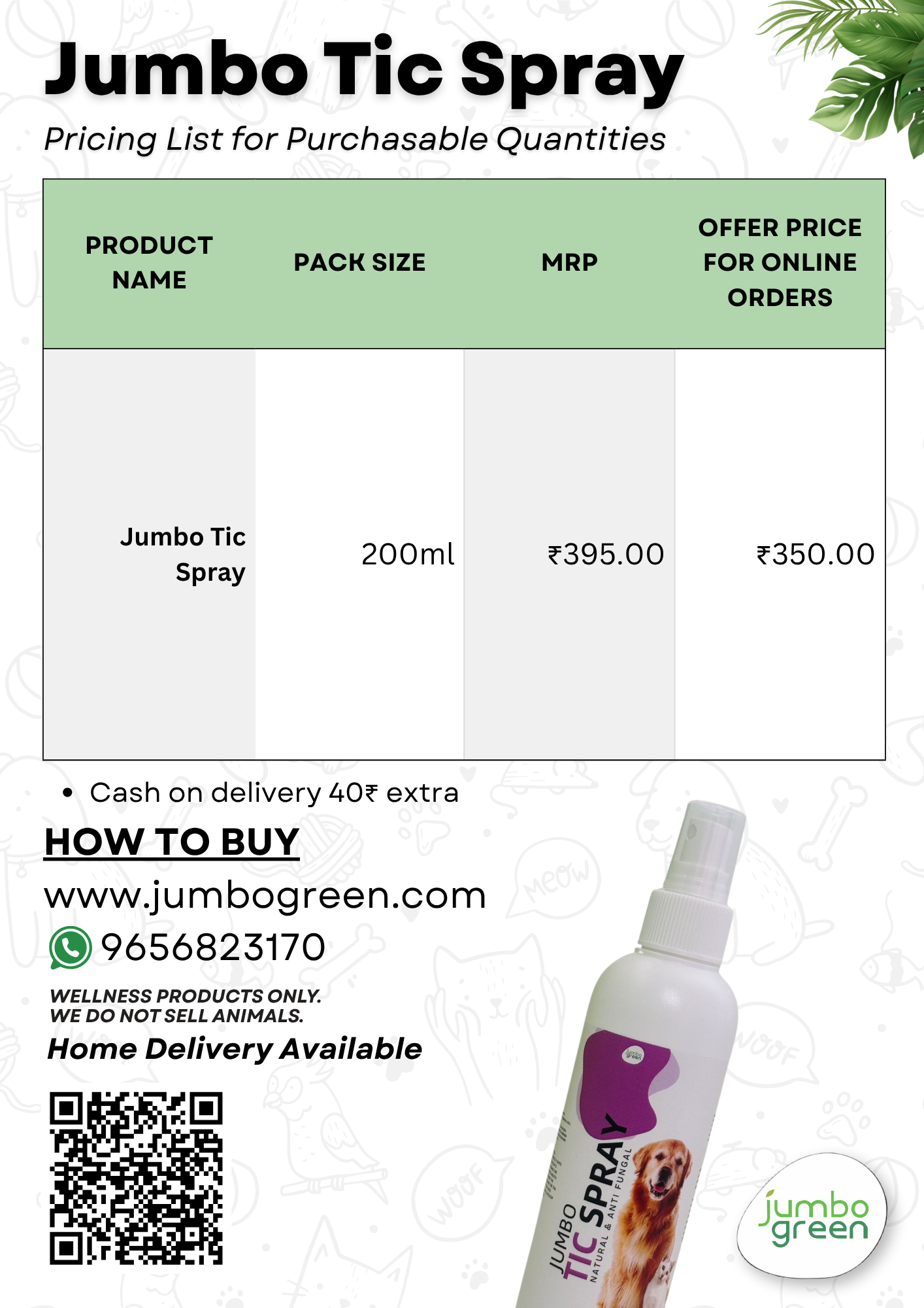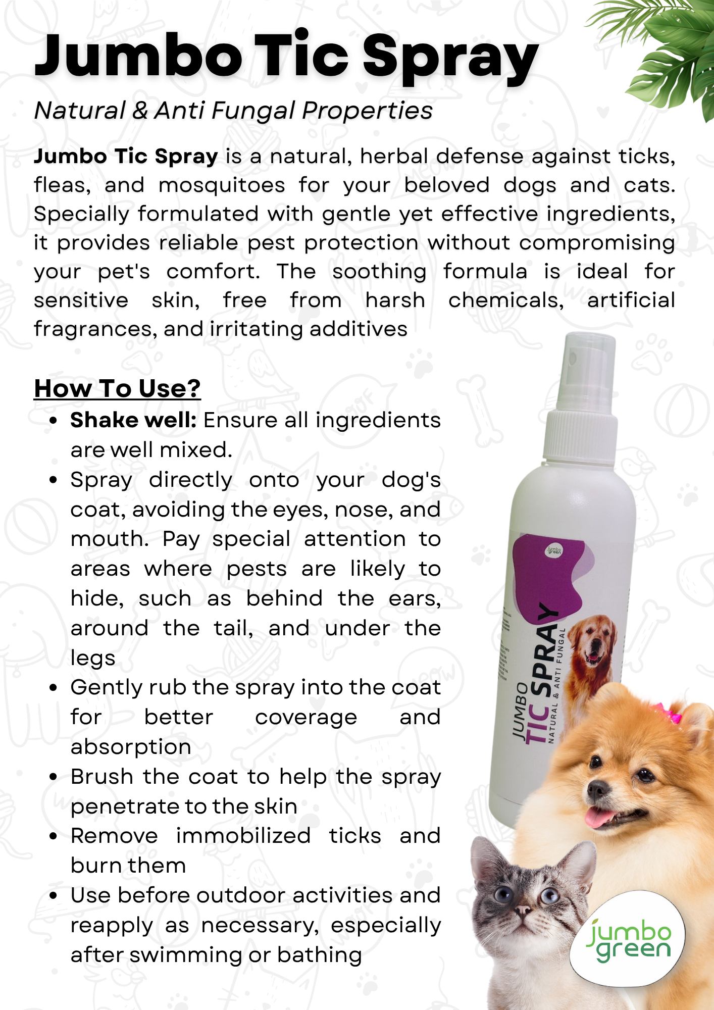 Jumbo Tic Spray is a natural, herbal defense against ticks, fleas, and mosquitoes for your beloved dogs and cats. Specially formulated with gentle yet effective ingredients, it provides reliable pest protection without compromising your pet's comfort. The soothing formula is ideal for sensitive skin, free from harsh chemicals, artificial fragrances, and irritating additives