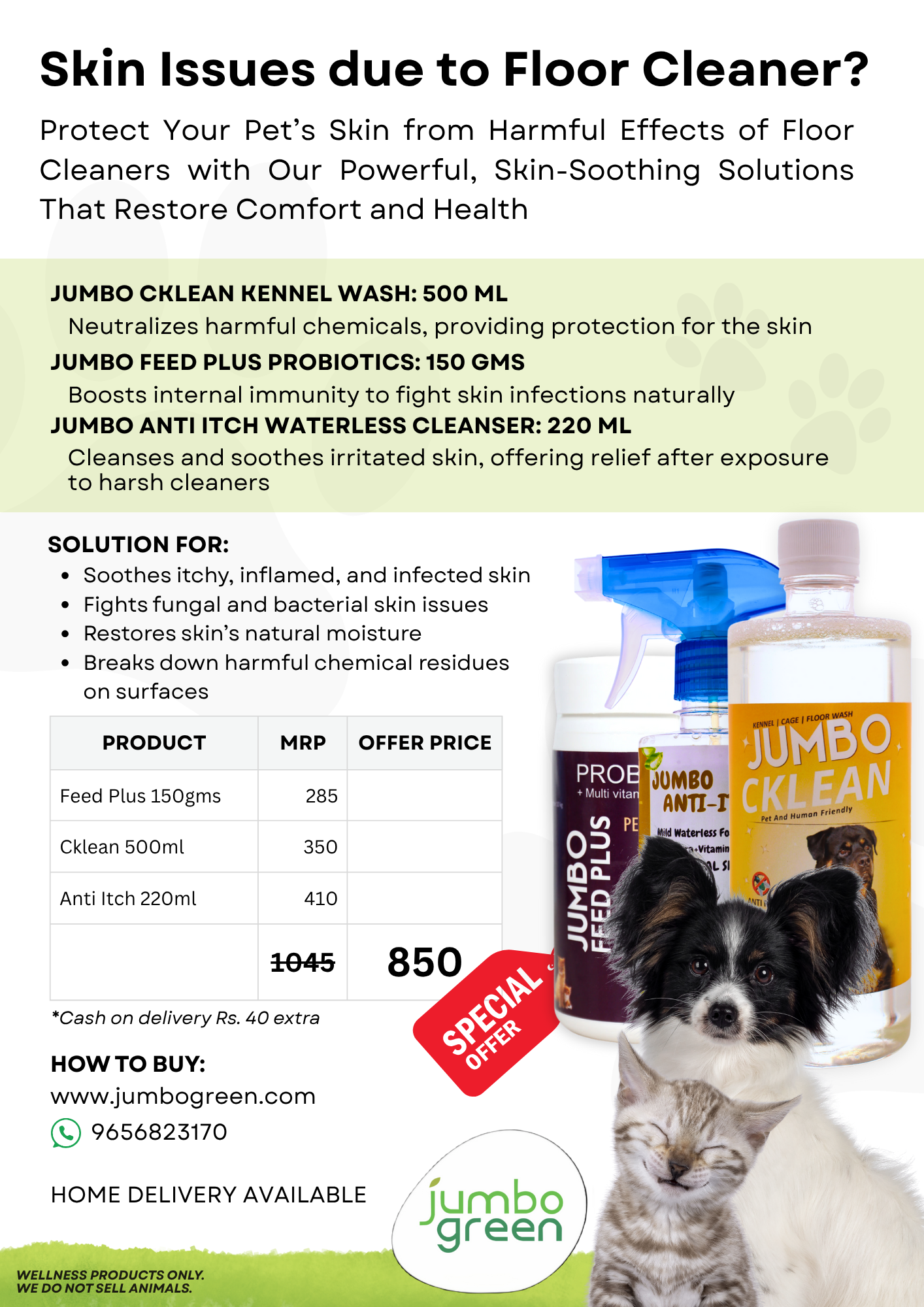 Protect your pet’s skin from the harmful effects of chemical floor cleaners with our powerful, skin-soothing solutions that restore comfort, health, and hydration. This 3-in-1 combo addresses both external irritation and internal immunity—ensuring complete recovery and protection.