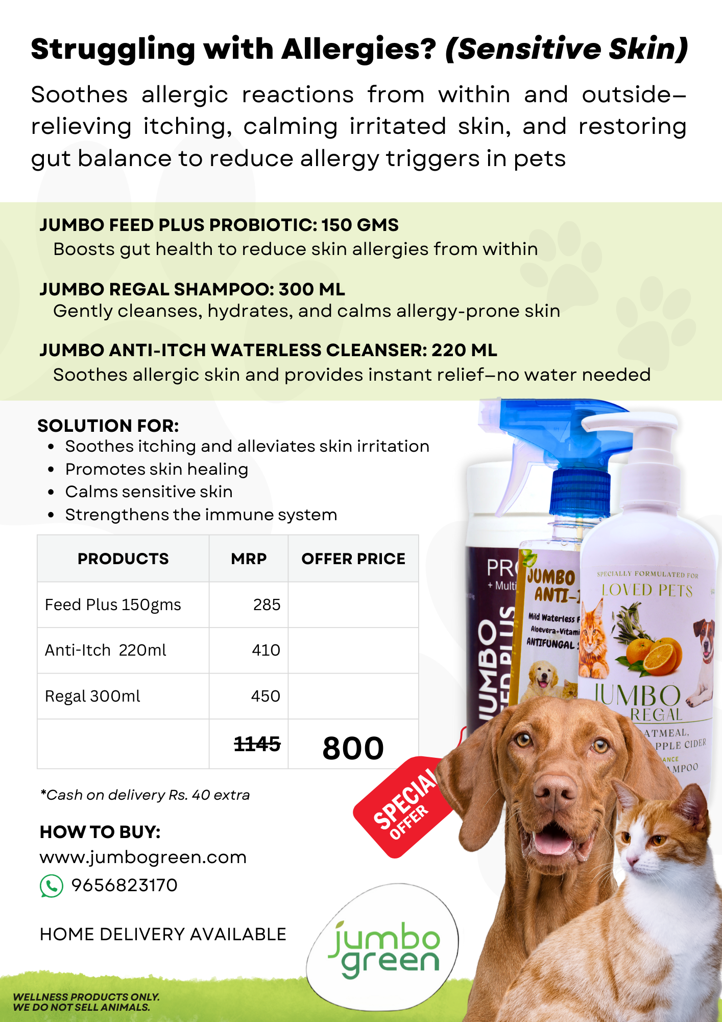 Soothes allergic reactions from within and outside—relieving itching, calming irritated skin, and restoring gut balance to reduce allergy triggers in pets