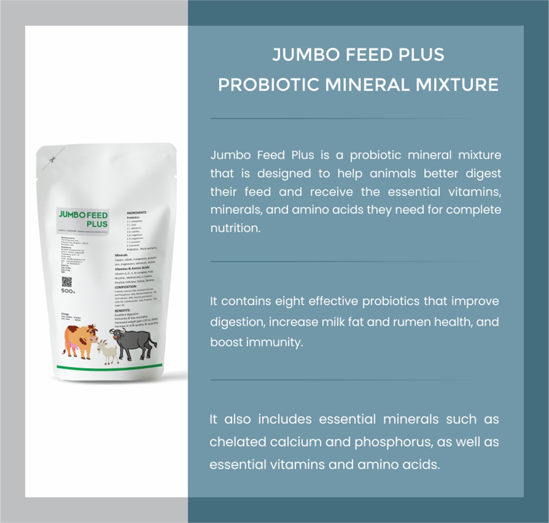 - Just 10gm per day per cow: Unlike other mineral mixtures requiring 50-100gm, Jumbo Feed Plus delivers powerful results with a significantly lower dosage.
